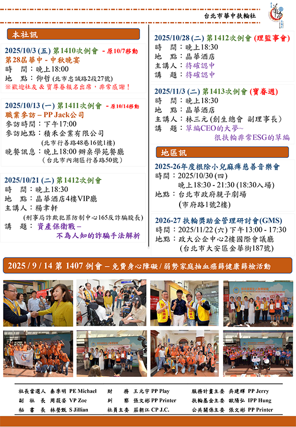 例 會:台北晶華酒店 例會時間:每週二晚上18:30~20:30