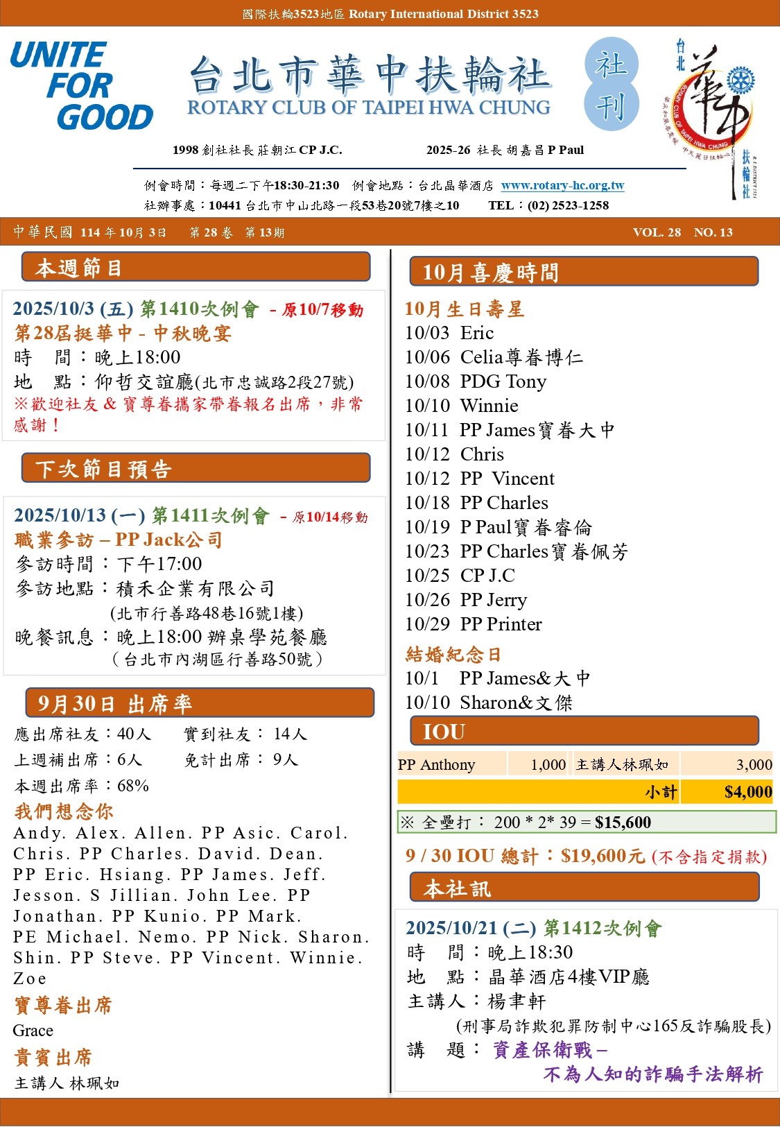 2025/10/3(五) 第1410次例會(原10/7移動)/第28屆華中- 中秋晚宴/時間:晚上18:00/地點:仰哲 (北市忠誠路2段27號)