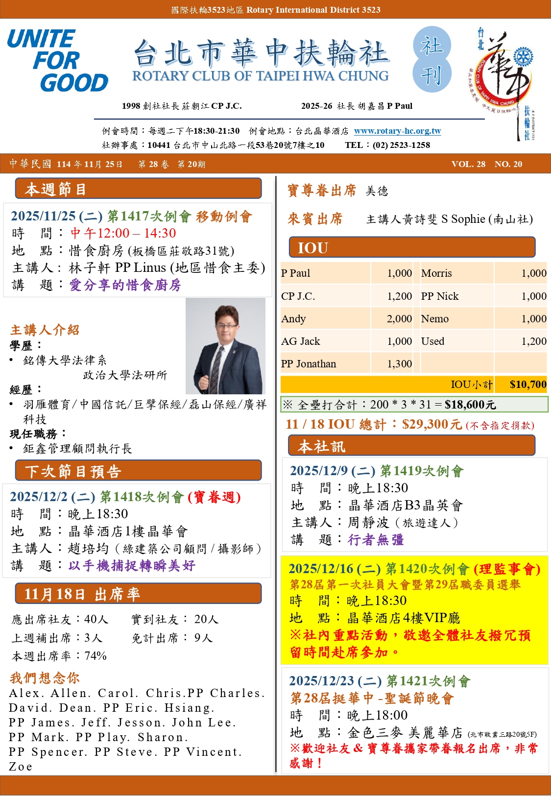 2025/11/25 (二) 第1417次例會移動例會- 惜食計劃/時間:中午12:00/地點:惜食廚房 (新北市板橋區莊敬路31號)/主講人: 林子軒PP Linus(地區惜食主委)/講題:愛分享的惜食廚房