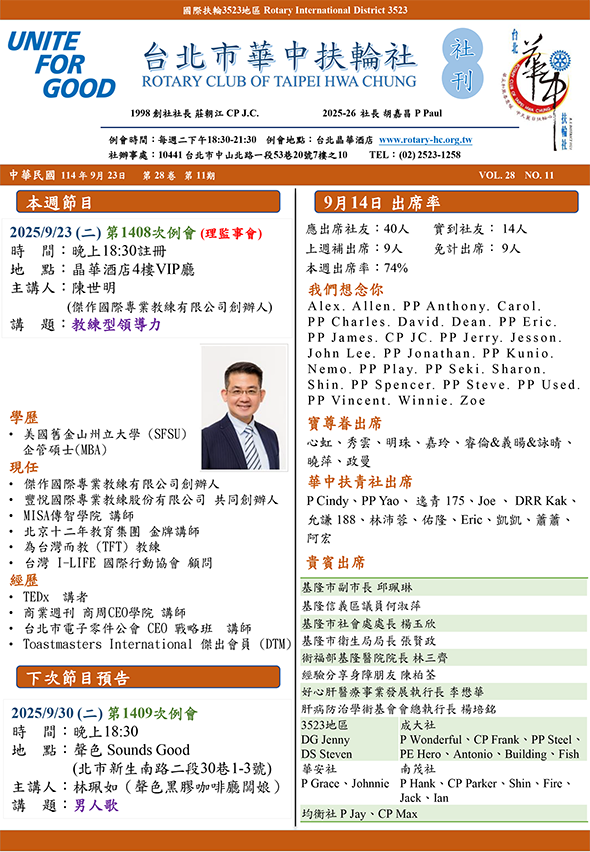 2025/9/23(二)第1408次例會(理監事會)/地點:晶華酒店4樓VIP廳/主講人:陳世明(傑作國際專業教練有限公司創辦人)/講題:教練型領導力