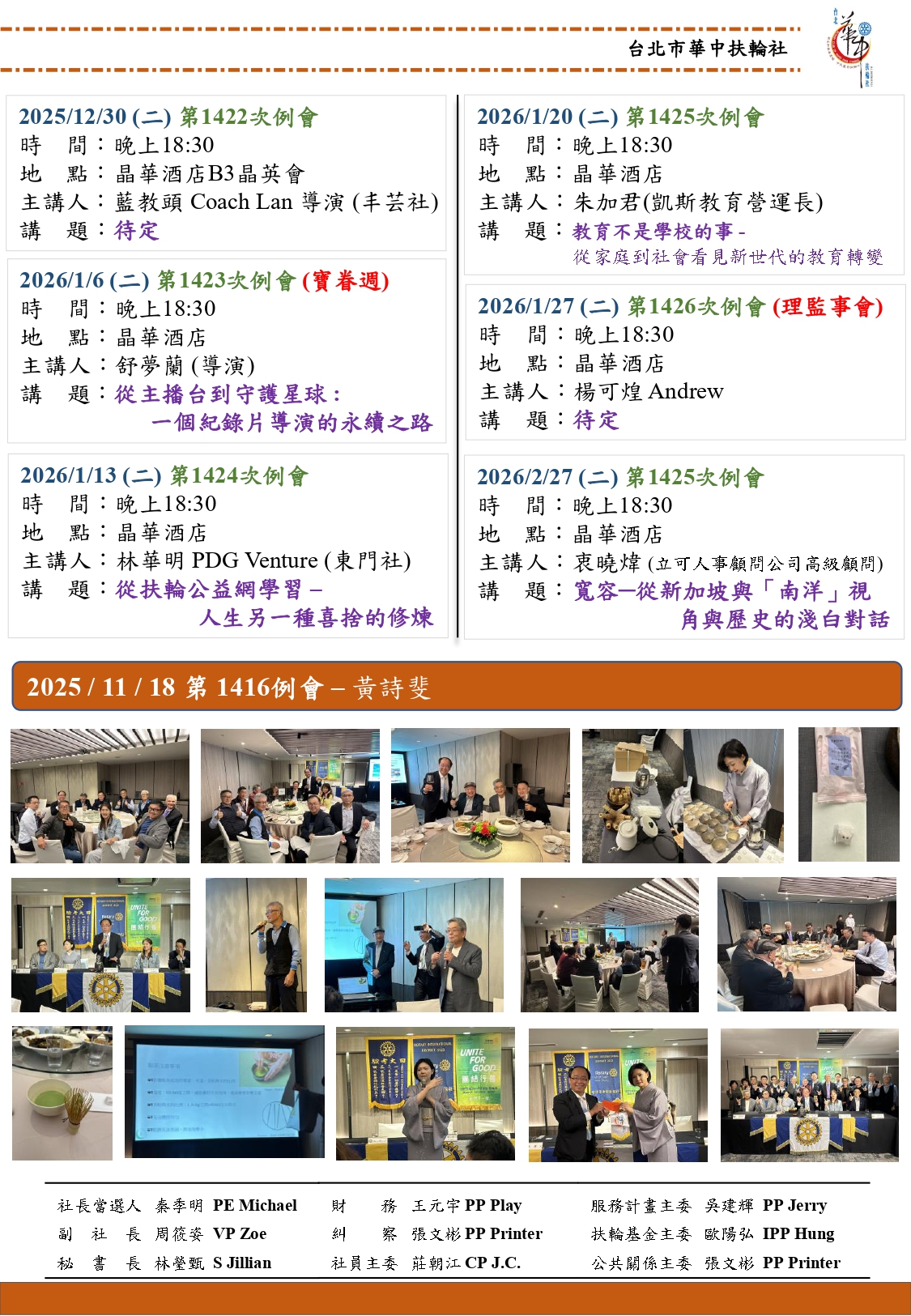 例 會:台北晶華酒店 例會時間:每週二晚上18:30~20:30